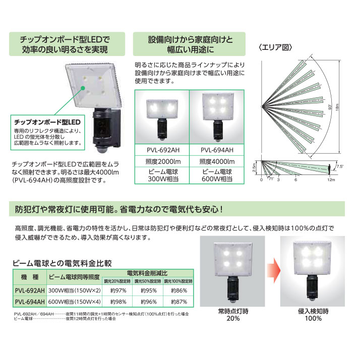 商品情報 品名 センサーLEDライト付きAHDカラーカメラ品番 PVL−694AH撮像素子 1/2.8型 SONY 2メガピクセルプログレッシブスキャン C−MOSセンサー画素数 総画素数 :2000(H)×1121(V) (約224万画素)有効画素数:1920(H)×1080(V) (約207万画素)解像度 1920×1080フレームレート フルHD(1080p):30fps映像出力 AHD/VBS 約1.0V(p-p)75Ω 切替 ネジ端子式調整用映像出力 AHD/VBS 約1.0V(p-p)75Ω 切替(映像出力と連動)装着レンズ オートアイリスバリフォーカルレンズ広角f=2.8mm、F:1.2 水平:96° 垂直:52°標準f=12mm、 F:3.0 水平:33° 垂直:19°[※1]推奨照度 10lx(F:1.2)[※2]最低被写体照度 2lx ( F:1.2、 電子感度UP:2倍、出荷時設定)0.2lx(F:1.2、電子感度UP:30倍)[※2]シャッタースピード オート、1/30〜1/50,000秒 切替フリッカーレス あり(FLK)ゲインコントロール あり(レベル調整可)電子感度UP オフ/オート(2/4/6/8/10/15/20/25/30倍)切替ホワイトバランス ATW/AWB/AWC(プッシュロック)/室内/室外 切替逆光補正 オフ/BLC/HSBLC 切替(レベル調整可)D−WDR オフ/オン/オート 切替(オート設定時レベル調整可)ノイズリダクション オフ/LOW/MIDDLE/HIGH(二次元、三次元)切替霧消し機能(Defog) オフ/オート 切替反転・回転 オフ/水平反転/垂直反転/180°回転 切替輪郭補正 オフ/オート 切替(レベル調整可)シェーディング補正 オフ/オン 切替モーション検知 オフ/オン 切替 4エリアプライバシーマスキング オフ/オン 切替 4エリア画素欠陥補正機能 オフ/オン(ライブ欠陥画素補正/白画素欠陥補正/黒画素欠陥補正)切替(レベル調整可)通信方式 同軸多重制御方式(Pelco−C)設定方式 OSD方式 日本語対応検出方式 パッシブインフラレッド方式検知エリア 立体型(最長部12m)電源電圧 AC100V(50/60Hz) ACプラグ式(コード長3.5m)消費電力 約63W点灯照度 4,000lm点灯時間 約3秒/約10秒/約30秒/約1分/約2分/約3分/約5分 (オフディレイ動作)点灯モード 点灯のみ(フラッシングモードなし)動作モード(昼夜判別) 約5lx〜∞lx(ボリュームにて調整)調光設定 0%/20%/50%/100%感度 約70%〜約130%(ボリュームにて調整 中点100%)検知出力設定 EE連動/EE非連動 (EE:昼夜判別制御)検知出力時間 オフディレイ (約2秒)/動作時間連動検知出力 無電圧リレー接点(C接点)AC/DC30V 0.5A(抵抗負荷) ネジ端子式角度調整範囲 照 明 部 :上下_6°〜(46°)左:60° 右:60°カメラ部 :上下_0°〜38° 左:45° 右:45°センサー部:上下_0°〜25° 左:45° 右:45°[※3]使用可能周囲温度 −10℃〜+40℃(結露なきこと)設置場所 屋内・屋外防塵・防雨性 防雨構造 IP55質量 約2,600g外観 ライト部:アルミ合金 本体:樹脂付属品 コードブッシング 1個、タッピングネジΦ4×25 2本、コンクリート用アンカープラグ 2本、エリアマスキングシール 2枚、サンシェード 1個、サンシェード固定ネジ M3×5 2本、調整用モニター出力ケーブル1本、キャップ 2個、 取扱説明書(保証書付き)1冊備考 ※1:装着レンズの垂直画角、水平画角はモニターのオーバースキャン率など、モニターの仕様により多少異なる場合があります。