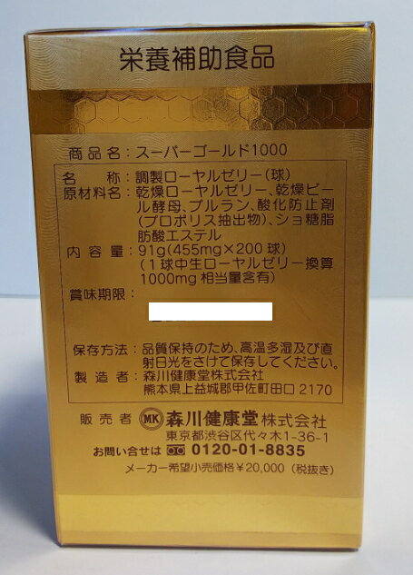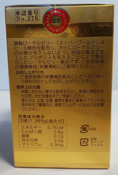 商品名 ローヤルゼリースーパーゴールド1000 名 称 調整ローヤルゼリー 内容量 200球 賞味期限 パッケージに記載 保存方法 品質保持の為、高温多湿及び直射日光を避けて保存して下さい。